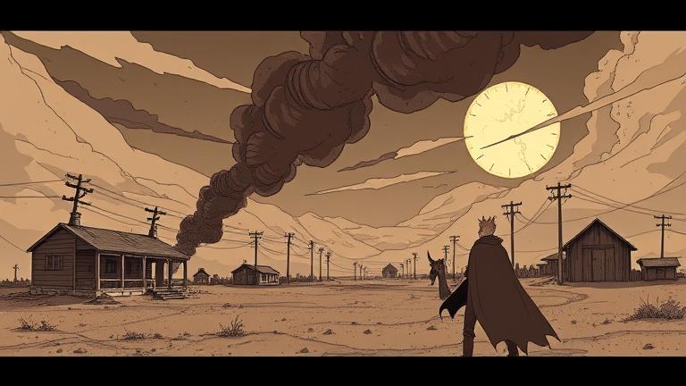 In the parched wasteland of the planet Gunsmoke, a town plagued by bandits sat quietly under the relentless sun. Vash the Stampede, with his spiky blond hair and trademark red coat, rode into town on his motorcycle, a gust of dust swirling around him. ‘Hello, citizens!’ he shouted with his signature grin. ‘I hope you haven’t forgotten your insurance policies!’ The town’s denizens peeked from behind closed shutters, uncertain yet curious.