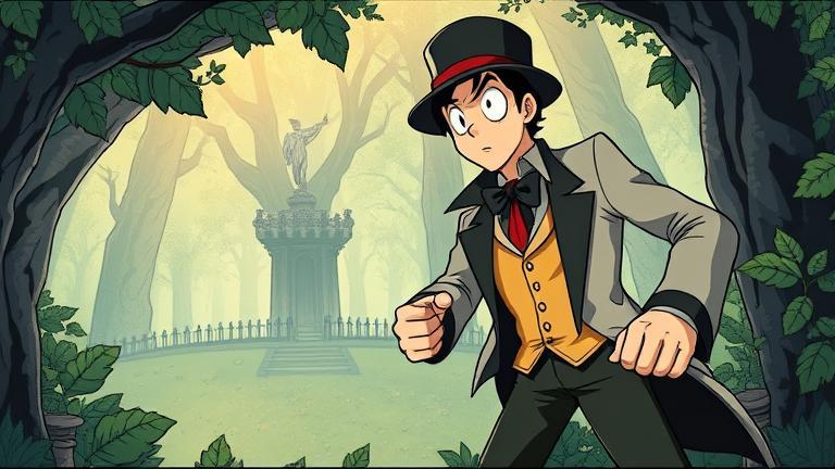 In the depths of an ancient forest, under a canopy where sunlight barely kissed the ground, Arsene Lupin III plotted his next grand heist. His clever mind raced, thinking of the legendary treasure hidden in the Enchanted Grove, said to belong to a long-lost royal family. ‘This time, old friend,’ he mused to his companion Goemon, ‘it won’t just be about the thrill. We’ll uncover the truth behind this family’s legacy.’