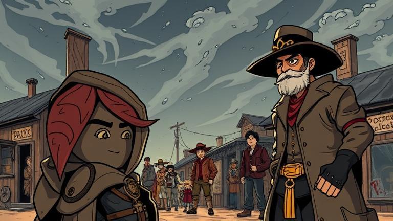 The bandit from the original crew, now gripped by compassion, stood in front of the townspeople, arms wide as a shield. ‘You see, the very thing you fear can be transformed! Protect what we’ve built!’ He shouted with defiance, his voice carrying conviction absent from his previous life.