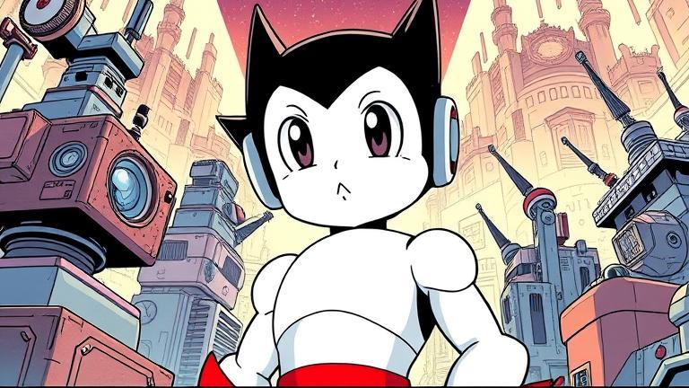 In the heart of Neo-Tokyo, Astro Boy stared out at the sunset from a rooftop, reminiscing about the days when cities were alive with wonder. Suddenly, a flicker of light caught his eye. ‘What was that?’ he muttered, adjusting his signature boyish hairstyle. With his jet boots activated, he shot across the skyline, following the glow that illuminated the darkening sky. Upon landing, he found himself face to face with a small, rusted robot held together by loose wiring and bright energy sparks.