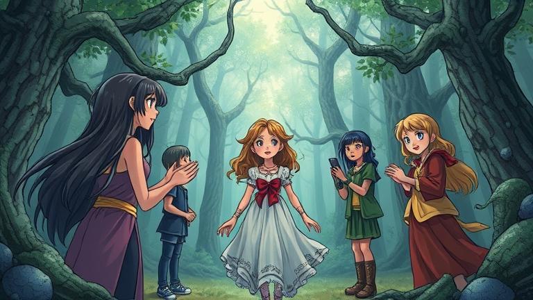 As darkness enveloped the glade, Lira’s luminescent wings pulsed like beacons of hope. ‘Close your eyes,’ she instructed, ’and let the forest speak to you.’ Hesitantly, the friends complied, feeling the earth vibrate beneath them. ‘What does it say?’ Leo whispered, voice trembling. ‘It’s a symphony of the past,’ Lira replied. ‘Feel it washing over you.’ Each friend felt a unique pulse: Maya’s memories of untold stories, Jake’s dreams of adventure, Tessa’s longing for acceptance, Sofia’s fears of isolation, and Leo’s struggles with skepticism. ‘These are your truths,’ Lira continued. ‘Face them.’