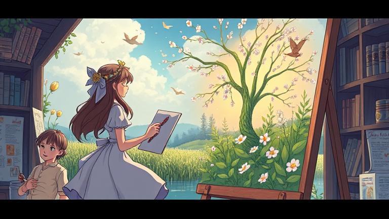 Marissa dipped her brush into multicolored paint as the symphony played. She felt the characters and landscapes merging—a magical scene began to result from companionship and cooperation. Each stroke brought forth new friends: a misfit unicorn, a wise old tree, and even a playful breeze.