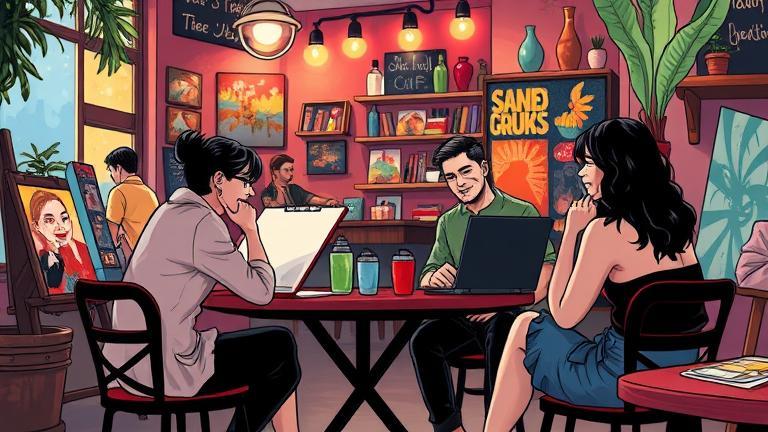 Under the shimmering soft light of the street lamps outside the café, a crisp autumn breeze swept through the space, infusing it with a refreshing perspective. As Marissa looked around at the familiar faces—Leo, Mia, Josh, and the new vibrant energy of Theo—she couldn’t help but smile. ‘It’s almost like we never left, isn’t it?’ she mused, her voice soft with nostalgia. ‘I think these walls hold our laughter even when we’re apart,’ Mia replied, her eyes sparkling with memories of their past creative exhibitions. Suddenly, the door swung open again, introducing an unfamiliar face: a young woman named Ella, an artist from a faraway city looking to showcase her work. Ella approached hesitantly, clutching a rolled-up canvas under her arm. ‘I heard about your exhibition and felt drawn to the energy here,’ she said, her voice a melody of nervous enthusiasm and passion. ‘What if we propose a spontaneous collaborative piece between us?’ Theo suggested, a twinkle in his eye. The idea sparkled as everyone nodded enthusiastically. Josh chimed in, ‘We could create our own mural on the side of the café!’ Laughter erupted again, and soon tables were pushed aside, transforming the café floor into their creative arena. Tossing around ideas, Marissa declared, ‘Let’s paint our collectively whispered dreams over a backdrop of pretty chaos!’ Without hesitation, Leo seized brushes and paint. ‘Chaos, huh? Let’s embrace it!’ He stood at the forefront, painting the foundation. As strokes filled the bare walls, each artist woven into the process, Ella reflected. ‘Every brushstroke feels like a heartbeat, doesn’t it?’ she mused, her palette combining hues inspired by each individual’s journey. Moments dissolved into hours as they embraced the vibrant energy swirling among them. Conversations flowed seamlessly, ranging from insecurities in their artistic pursuits to heartwarming inspirations for their creations. The playful banter fed their enthusiasm while they painted. With each cautious stroke, they echoed their struggles and victories. Marissa, tangled in paint and laughter, turned to Ella, ‘What brought you to art?’ Ella paused, wiping a splash of color from her cheek, ‘When I paint, I express the pieces of me that feel unseen. It’s like giving those shadows a voice.’ As the mural grew, distinctions blurred between their individual dreams and newfound bonds. Last strokes were laid when Miss Clara entered, admiring the glorious chaos sprawled before her. ‘This is stunning! You’ve outdone yourselves—again!’ The artists erupted into cheers as they stepped back to observe their joint creation, a tapestry of colors extending like a heartbeat across the wall. But the exhilaration was swiftly interrupted by an abrupt voice coming from the doorway; it was the art critic again. ‘Interesting collaborative approach, but does it truly convey a unified message?’ he scrutinized, causing a wave of uncertainty to ripple through the group. Marissa placed a hand on her hip, boldly retorting, ‘Isn’t the essence of art to reflect myriad emotions rather than singular narratives? Unity in diversity is powerful!’ The critic appeared taken aback by her confidence. ‘A fair point,’ he conceded, a ghost of appreciation flickering in his eyes. The conversation shifted into philosophical queries about collaboration versus individual artistry—a thoughtful dialogue that bridged understanding among artists from different backgrounds. Encouraged, Leo added, ‘Collaboration reflects our interconnected stories; we inspire and elevate each other! Such is life!’ Inspired by the visit, the critic departed, leading to raucous laughter filled with relief and camaraderie. As excitement filled the room, the five artists relished their creative collective, a reflection of their combined journeys. The café bustled with newfound energy, friendships intertwining harmoniously. Swirling leaves painted their skies orange and yellow, reflecting the warmth and vibrance of the day. Theo, sensing a shift, grabbed his guitar, inviting anyone willing to join him in song. ‘Let’s create a soundtrack for our mural,’ he suggested. The room lit up as Marissa and Mia harmonized along, Josh beatboxing with a laughter-laden rhythm. Together, they adorned the canvas of their lives with colors of laughter, notes of hope, and chords of friendship. A profound realization settled amongst them: while their separate stories had brought them here, it was their shared creation that transformed them. They weren’t merely individual artists but a chorus of transformative experiences, enriching one another through lively strokes of color, sound, and emotion. In this cozy café, they found a sanctuary, a place where their art transcended the canvas, fostering connection and understanding. Beneath that mural, with fresh vibrant colors glowing softly in the evening light, five friends formed the collective tapestry of life—dreamers, makers, and renegades of rhythm and narrative.