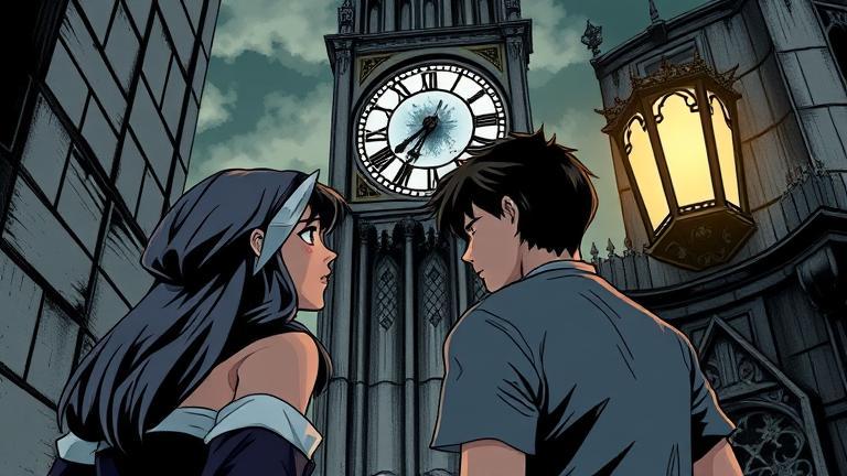 Time unravelled, showing vibrant scenes of the town decades ago. A young couple stood below the clock tower then, their hands entwined like roots tangled deep in the earth. ‘They were like us, full of hope,’ Noah whispered, fear quietly replaced by empathy as he gripped Sarah’s hand tighter.