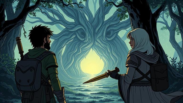 A rustling sound drew their attention, and a tall figure shrouded in shadows emerged from behind a great oak tree. ‘Beware!’ intoned the figure, whose faceless hood emanated a chilling presence. ‘I am Morwen, Keeper of Shadows. To pass through my domain, you must confront not only your past but also your future. Will you risk losing what you value most?’