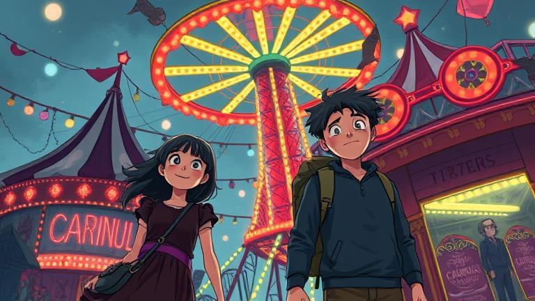 Bursting through the dazzling exit, they emerged onto the glimmering grass of reality, lit by stars. They weren’t just any friends anymore; they conquered fears together. The carnival faded, its remnants lost to the night, yet the mystery of it lingered in the silence.