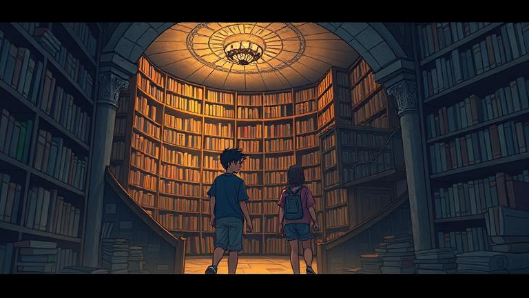 As they ventured deeper, the air grew thick with the smell of old paper and dust. The tunnel opened into a large room full of towering bookshelves, every inch lined with books of every size and color. ‘This is incredible!’ Lila said, her eyes wide with wonder. ‘Look at these old manuscripts.’