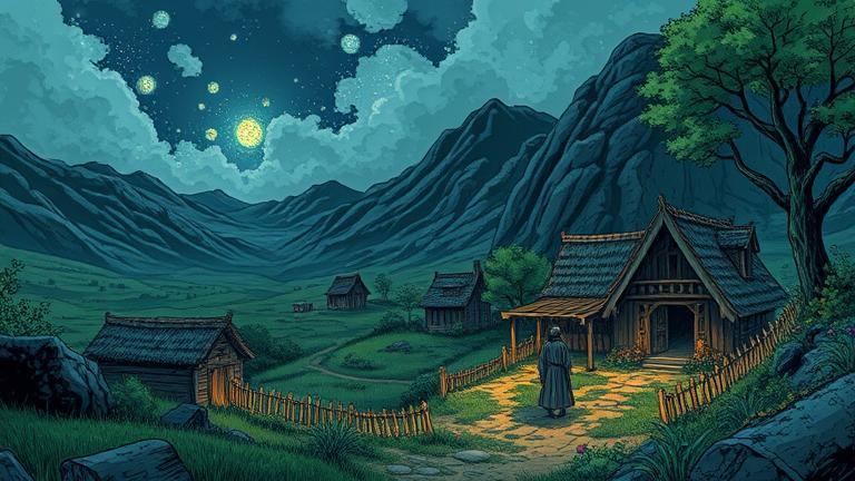 However, nightfall brought other visitors—a raven perched on a crooked branch above, cawing a warning. The villagers looked up in alarm as the darkness stretched across their gathering, a swirling smoke threatening to suffocate the light.