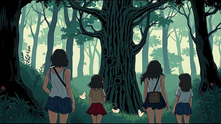 The friends looked at each other, laughter spilling forth while sunlight broke through the branches above, revealing a path leading away, bright and inviting.
