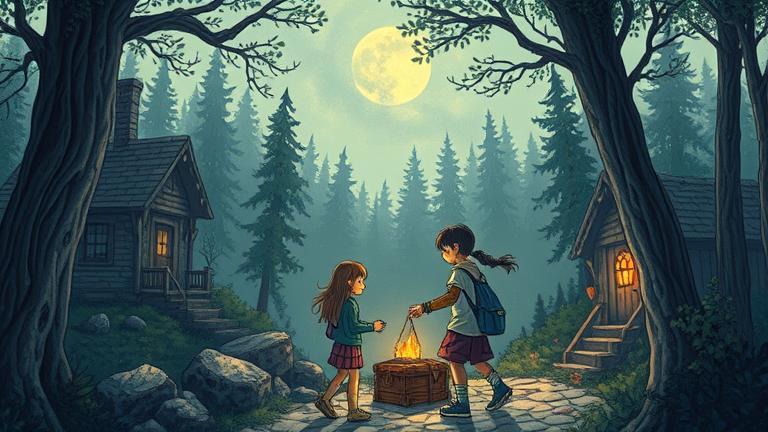 There, nestled in the rocks, was a glowing chest, ornately carved with motifs of moons and stars. Together, they lifted the lid, and an array of colors burst forth, showering them in radiant light. Inside, the ancient gem sparkled, its gleam mesmerizing.