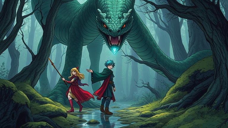 Liora unleashed a spiral of emerald energy from her staff, sending a dazzling wave towards the creature. ‘Feel the magic of Eldoria!’ she cried.
