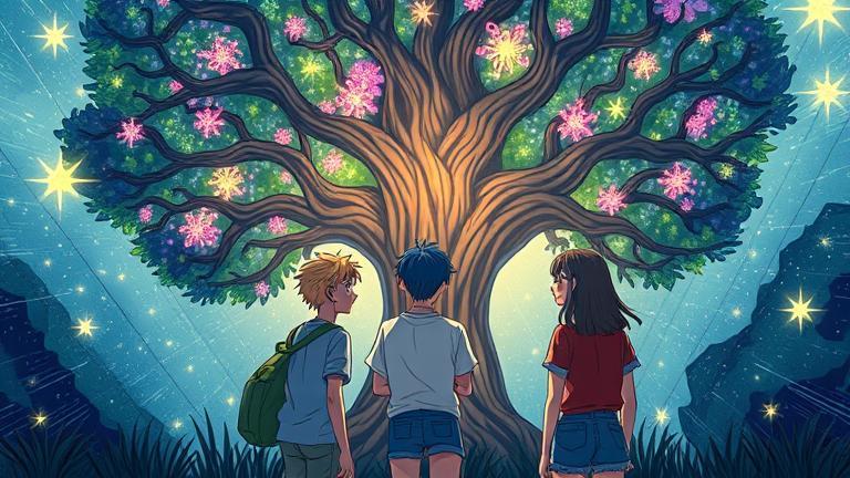 In the quaint village of Eldergrove, three friends, Mia, Jake, and Clara, gathered near the ancient oak tree at the edge of town. As the sun dipped below the horizon, casting a golden hue over the leaves, Mia remarked, ‘You know, the legends say this tree can grant a single wish to those pure of heart.’