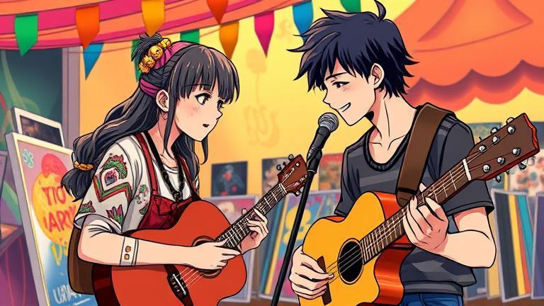 The electric atmosphere of the Harmony Festival enveloped Mia and Ethan as they prepared to present their created mural, a tangible representation of their newfound partnership. Approximately fifty people had circled around them, excitement sparkling in their eyes. Mia glanced at Ethan, her eyes bursting with happiness. ‘Can you believe this?’ she exclaimed, a wide grin crossing her lips. Ethan chuckled, a blush creeping on his cheeks, ‘It’s surreal! I never imagined our first collaboration would draw a crowd like this.’ ‘It feels like a dream,’ Mia mused, carefully inspecting their mural, which displayed swirling elements of blues and sunset hues, reflecting the music that inspired it. As Mia dipped her brush into brilliant green, a voice called from the crowd. ‘What’s the story behind this amazing piece?’ A girl, not more than ten, tugged at her mother’s arm, pointing wildly at the mural. Mia felt her heart swell. ‘It’s about how music and art can come together to tell a story,’ she explained. Ethan supplemented, ‘Every stroke is inspired by the feelings each note evokes.’ A taller teenage boy chimed in, ‘Can we hear you two perform together?’ Ethan’s eyes widened with surprise while Mia raised an eyebrow, egging him on with her gaze. ‘We could play the piece that inspired the mural!’ he suggested, exuberantly plucking at his guitar strings to warm up, while Mia moved closer. Fueled by enthusiasm, the crowd resonated with applause, urging them on. She agreed, stifling her nervousness with bravery. ‘Let’s do it!’ As Ethan strummed his guitar and plucked the melody softly, Mia began to move along, her fingers dancing across the canvas like the notes floating in the air. The audience hushed as they started the performance. Members of the crowd swayed to the music, becoming entranced by the artistic display of collaboration. People whispered and shared their interpretations, creating a shared experience felt by many. One elderly gentleman recalled memories of his passionate youth, while a young couple felt buoyed by the excitement of love in the air. The synergy between Ethan’s music and Mia’s artistry breathed life into the atmosphere, leading to spontaneity among the festival-goers. As Mia brushed a stroke of pastel yellow, signaling hope’s arrival in their mural, she felt moved by the expressions around them. ‘Do you hear that?’ Ethan softly remarked between musical pauses. ‘What?’ she asked, her focus on the crowd and the finish of their pieces. ‘People resonating with our work!’ His eyes sparkled. They felt unity in shared artistry. After completing their song, the crowd erupted into thunderous applause, and with flushed faces and smiles brighter than the starlit night, they took a bow. ‘This feels incredible,’ Ethan whispered, his heart pounding with exhilaration. ‘I think we should do more of this. Collaborate more often!’ Mia nodded vigorously, the twinkle of joy evident in her eyes. ‘Definitely! I can see us creating magic time after time.’ Just then, Lila weaved through the crowd to join them, pride evident on her face. ‘You two are the crowd’s favorites!’ she cheered. Encouraged by her enthusiasm, Mia added, ‘We’re just getting started!” As the festival continued into the night, the artists realized their connection was deeper than just art. They felt a sort of kinship growing, unified by creativity. With each moment, they spoke of dreams and projects for the future, planning to take their partnership beyond the festival. Inspiration lingered in the air as fireworks soared overhead. ‘Let’s create a gallery together,’ Mia suggested, excitement bubbling within her. ‘We could even host mini-live installations.’ Ethan’s eyes gleamed at the prospect. ‘We’ll create a series! Where your painting meets my melodies—again and again!’ The contemplative evening faded into night, but the dawn of their collaboration lingered. On their festival day’s last note, they pledged to carve out a distinct path together. Eventually, Mia turned to Ethan, a teasing smile playing on her lips, ‘And to think, I was scared to talk to you earlier!’ He laughed, ‘Dare I say, it was destiny bringing us together.’ So, amidst laughter and promises, they stepped forward, two artists bound by creativity and the harmony that resonated from their souls.