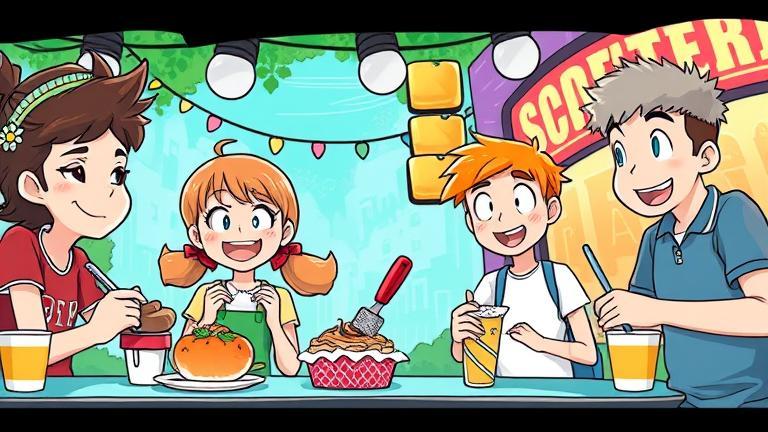 As dawn broke over their campsite, the vibrant colors of the town began to glow beneath the golden sun. Sam stood up and stretched, saying, ‘Today feels special; we need a new challenge!’ Lila, lying on her sleeping bag, propped herself on her elbows and beamed with excitement, ‘How about a food scavenger hunt around town? Discovering weird snacks is the ultimate challenge!’ Everyone nodded enthusiastically, except for Jake, who raised a suspicious eyebrow. ‘What defines weirdness? Is it just bizarre combinations, or does presentation also play a part?’ Mia, feeling inspired, exclaimed, ‘Both! Let’s agitate the taste buds and challenge the eyes!’ The group agreed it was going to be an epic day, determined to uncover the town’s oddest culinary offerings.
