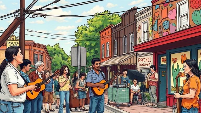 The morning sun filtered through the trees, casting dappled shadows on the town square where the revival commenced. Emily’s heart swelled with anticipation as she checked on the preparations. The colorful mural glistened under its loving coat of varnish, a shimmering testament to the community’s unity. As she caught sight of Josh rummaging through picnic supplies, she called out, ‘Hey, have you seen the spread for the potluck?’