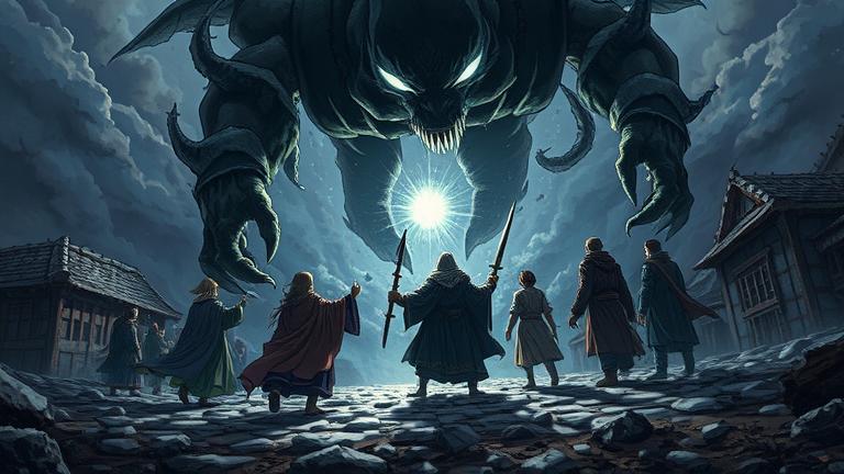 As the vile shadow began to quiver from the relentless assaults, a fierce cry echoed through the smattering of raindrops. It was Mikhail, the village hunter, who defiantly leaped into view, bow drawn taut against the sky. ‘The beast is faltering; now is our moment!’ he declared, channeling the spirit of his ancestors who had faced peril before him. Elara nodded in affirmation, darting from side to side, searching for the slightest opening. ‘On my signal!’ she shouted, readying herself.