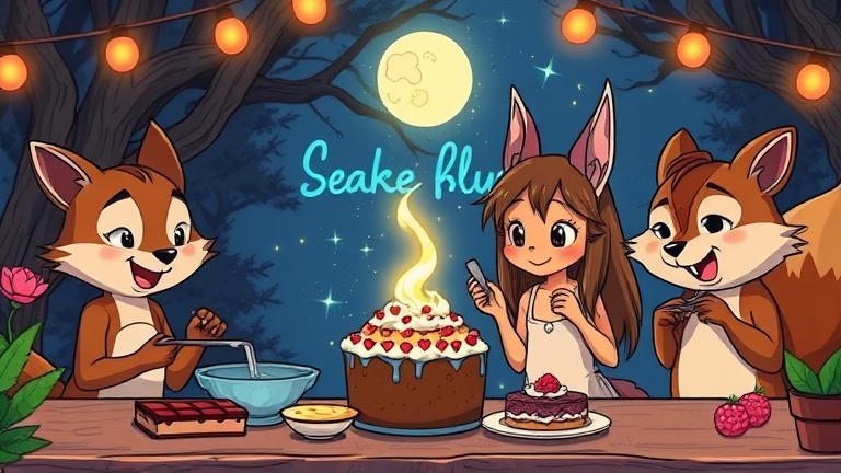 As the morning sun began to peek through the trees, Benny opened his eyes to a sight that took his breath away—a still shimmering lake reflecting the dappled lights across the dew-kissed grass. He remembered the magical night prior, surrounded by laughter and the playful antlers of their newest friend, Sprinkles. Tessa was already up, her apron on, as she meticulously arranged their dessert creations. ‘Today, we shall celebrate last night’s thrilling bake-off by showing these additions to our forest friends!’ she declared enthusiastically.