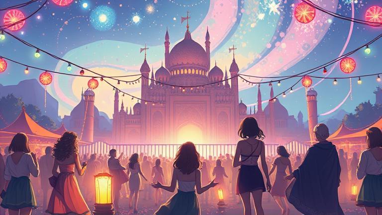 ‘Yes! A celebration of dreams!’ Clara added, her heart racing with excitement. ‘Let’s invite everyone and share our stories!’ With purpose, they began to collect sparkling gems, each resonating with rhythms of laughter, love, and light, crafting decorations for their festival.