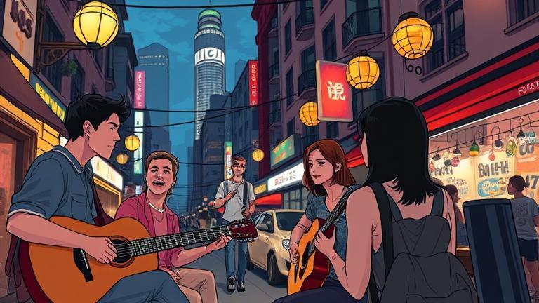 As the friends buzzed with excitement after their rooftop jam, new adventures awaited them below. Zoe, energized by the stories they had begun to uncover, led the charge into the street. ‘Can you feel that? It’s like the city is alive!’ she exclaimed, as the group descended the stairs and spilled out onto the bustling sidewalk.