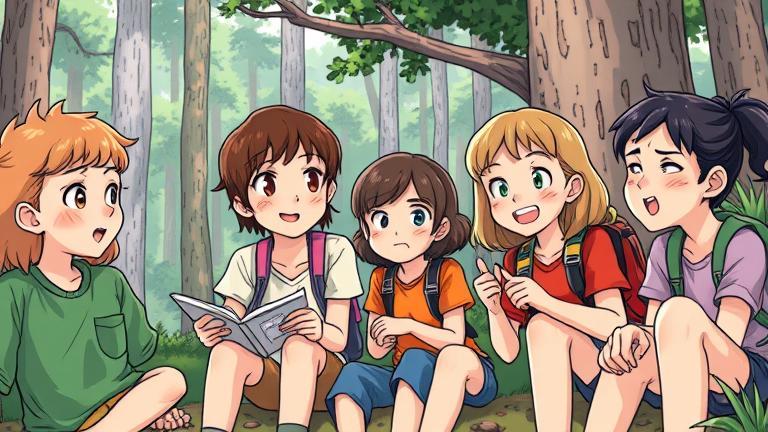 Lily clapped her hands. ‘Yes! We each add a part of the story!’ The campers eagerly agreed as the shapes of trees blinked in and out of their flashlights.