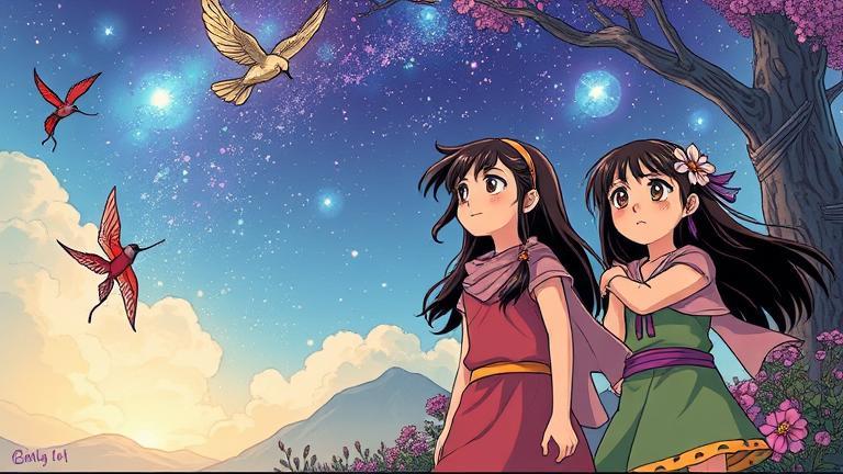 Elara, feeling bold, waved at them. A creature with feathers like a peacock and the tail of a dragon fluttered into view. ‘Welcome, travelers! I’m Kaelan. You’ve come with quite a flourish! What brings you to Nymfara?’ Tightly gripping her kite, Maria managed to stammer, ‘We… we wanted an adventure!’