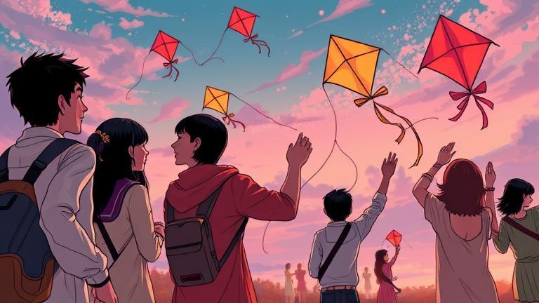 As the sun began to set, casting an orange hue across the village, the friends gathered again at their secret spot under the ancient banyan tree. Lila held up her intricately designed kite, adorned with vibrant colors symbolizing her family’s roots. ‘This will be my tribute to my grandmother,’ she announced proudly. ‘She always told me that dreams soar higher than our fears.’ ‘Speaking of dreams,’ Scor said, waving his kite. ‘I’m weaving the tale of my uncle who ventured far beyond the mountains to seek his fortune.’ The excitement was palpable as Zara turned to Tarek. ‘What about you, Tarek?’ she asked, her curiosity piqued. ‘I’m connecting my kite to my father’s triathlons,’ he replied, a twinkle in his eye. ‘He always said determination can move mountains. Each fabric patch represents a challenge he faced.’ ‘That’s brilliant!’ chimed Amir. ‘Storytelling can make this day even more unforgettable.’ As they crafted their kites, small interjections of laughter accompanied by debates over kite shapes and colors filled the evening air. ‘Maybe there should be a ceremony for the winners!’ suggested Yusuf, imagining the scene in his head. ‘We could invite the whole village!’ ‘They could even tell their own stories too,’ said Lila, rapt with the idea. ‘Sharing stories has a way of weaving connections.’ After several hours, the friends stepped back to admire their creations: Lila’s butterfly kite, symbolizing hope, Scor’s dragon kite breathing fierce ambition, Zara’s phoenix kite, radiant and colorful, representing rebirth, and the competitive spirit in Tarek’s hawk kite. The night that followed was filled with anticipation. They lay under the starlit sky, sharing the legends they would tell alongside their kites. Zara shared her family’s tale of crossing seas, while Amir spoke of a magician ancestor who could manipulate the winds themselves. As they shared stories, something shifted. They realized their individual dreams were interwoven, creating a stronger tapestry that represented their friendships. The night went on, the laughter under the ancient banyan tree resonating in the air. When morning finally arrived, they set off to fly their kites, the sky filling with both colors and stories. With each kite that took flight, they shared a piece of who they were. Lila’s kite soared closest to the sun, igniting a spark among them. ‘Look at that!’ Tarek shouted. ‘It’s like your dreams are lighting up the sky!’ ‘And ours are following behind!’ Scor added, watching his dragon kite dance beside her. At that moment, they realized there was no need for a competition; their shared dreams and stories made each kite a winner in its own right. The village gradually gathered, children squealing in delight as colorful kites filled their eyes with wonder. As legends passed from generation to generation, new memories were being etched onto their hearts and into the very fabric of the village’s soul. They flew their kites high, reveling in the freedom, each string pulling their hopes closer to the skies before them.