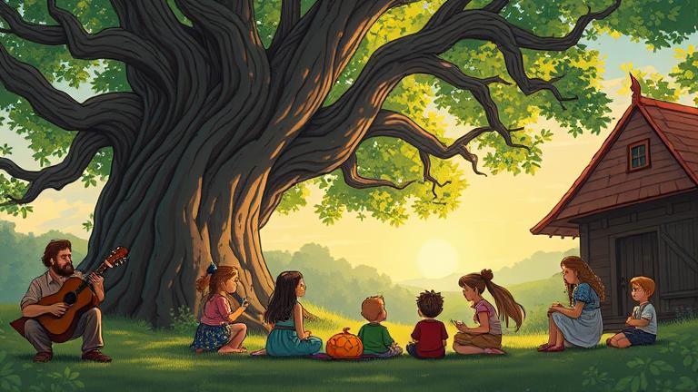 In that euphoric swirl of ideas, Sam played an impromptu tune on his guitar, pulling Lucy and Tom into song. ‘Come gather to the oak where tales get told and memories unfold!’, and soon everyone joined in, a glorious celebration of shared hopes. Underneath the transforming twilight, Mr. Brown broke into a jig.