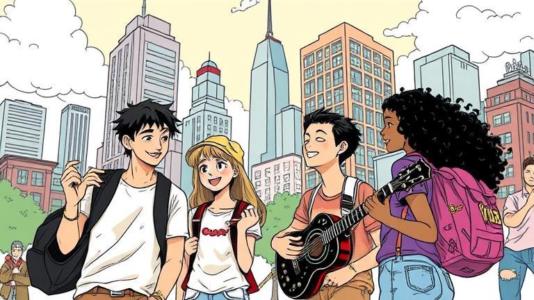 The friends buzzed with excitement as they navigated the lively streets following their rooftop jam. Zoe, invigorated by the adventure, led them towards a new phase of exploration. “Can you feel that? It’s like the city is alive!” she exclaimed. Max picked up his guitar, strumming enticing notes that tempted sounds from onlookers around them. He smiled and suggested, “Let’s play and see who gathers!” The giggling crowd drew closer, swaying to the joyful melody he created.
