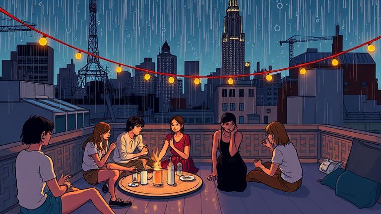 As the rain subsided, Array’s vivid canvas shimmered with reflections of the lively crowd around them. Dylan strummed a gentle melody, his fingers dancing across the strings, inviting everyone to whisper their stories once more. ‘What if we each share what this night means to us?’ he proposed, his face lit with the spirit of collaboration. Juno, holding her sketchbook like a treasure, piped in, ‘I’ll sketch each story while they are being told!’ Intrigued, Charlie suggested, ‘And I can dance paired with each person’s tale—expressing your words in movement!’ Array nodded enthusiastically, seeing how this collective spirit would weave a new layer over their art. The circle began with Mira, who nestled her little voice within the crowd. ‘This night feels like magic! I can feel the stars,’ she exclaimed, her eyes bright as they twinkled above. Array, keen on her confession, encouraged all around for sharing like a fluid river of experiences. Everyone took turns, weaving their anecdotes, while Juno sketched quickly, her pencil gliding like a gentle breeze over the pages. “Once, I stood in the rain feeling lost,” a stranger began, his voice shaky yet strong, “but tonight in this beautiful chaos, I found my purpose.” Array added a brushstroke of cool blue to the canvas, identifying with the yearning of the world. Next, a young woman with vibrant pink hair shared that she had almost given up on her dreams, but with her newfound friends, she felt ready to pursue them fervently. The dancers twirled with sincerity, channeling an emotional surge through fluid movements. Even the shyest among them broke free of their shell—a moment of vulnerability changing everything. Gradually, the mood intensified as each story became a thread casting open hearts. Array’s painting transformed, reflecting emotions with each drizzle of color; they realized the shifting shapes mirrored not just their personalities, but their sighs, hopes, and transformations. Mira’s stone nestled warmly in every corner, a symbol of pure joy and pride for her own journey. And so, laughter intertwined with storytelling. Charlie opened their arms wide, dancing under the moonlight, inviting everyone—’Step into the mystery; let’s all dance to this unyielding beat!’ An urge swelled within them to liberate a dancing circle where they flowed together, exploring moves created from joyous chaos. Array smeared paint dipping their brush into the rhythm of folk bonds being born, recognizing the power of community flourish. Gradually, the music surged again from quiet strumming into an energizing anthem of resistance—crafted creating a new melody igniting warmth, weaving their group into an understanding of hope forged in darkest moments. In that, friends new and old sang gleefully yet unflinchingly, believing in one other. Hand in hand, this celebration echoed a promise; beyond tonight’s festivity, it morphed into an unyielding platform to collate each other’s vibrancy for years to come. “Imagine,” Array told them with fervor, recalling sunny skies that gathered memories; “we can host workshops every month—building deeper connections, breaking chains wrapped around lonely hearts!” One by one, they chimed in, ignited by Array’s vision. Dylan’s voice chimed in, “I’ll handle the music and jams!” while Juno exclaimed, “I’ll provide sketch workshops with local stories woven in!” All this drew them closer, newfound dreams blossoming at the tendrils of solidarity. Charlie smiled wide, capturing moments, as friends began exchanging sporting dances, exchanging ideas, and blending backgrounds. “Every canvas needs backing,” Mira questioned from the side, her childlike spirit asking how they would reach others even further. Charlie nodded, ‘Outreach! We’ll collaborate beyond this rooftop—turning these colorful sights into pop-ups around town!’ In this way, Array’s vision carved a canyon in conversations, which would infiltrate each of their dialogues even when lonely. Glimpses of fireworks suddenly erupted against the sky, a reminder of the promises blossoming alike—a celebration not just of artistry but of kindred souls affirming life together. Array shivered, reflecting on the painted masterpiece of the night; they rejoiced with what life could offer with resilience intertwined, stitching threads of dreams together. This night had blossomed an undying connection they followed, forever joined through each echoing promise of art. Their comedic and heartfelt exchanges would paint the hues of dawn, lining the roofs yet to witness the vibrancy woven deep within; every heart pulsed brightness hidden amongst whispers, emboldening them life long after the raindrops dissipated. They did not simply celebrate the now, but the forever that continued to bloom beneath the foundations of camaraderie, as twinkling lights filled the skies overhead.