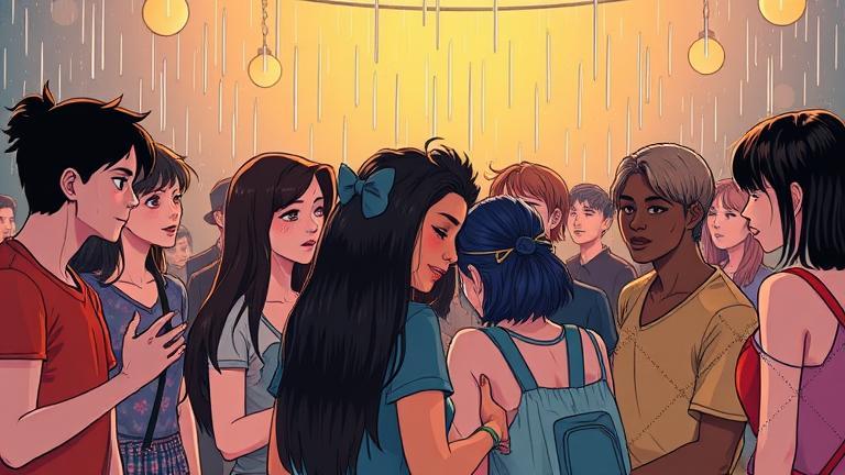 As the rain created a textured canvas on the cobblestones, the artists circled tighter around the newfound source of inspiration: the vulnerable cloaked figure who slowly began to reveal their inner self. Mira, sensing the air thick with untold stories, leaned closer, whispering encouragement. ‘There’s strength in sharing what lies beneath the shadows,’ she said, her voice warm and inviting.