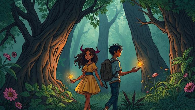 The serene glade was alive with whispers as Jena and Malik stood beneath the grand canvas-like tree, its leaves shimmering in various shades of green.
