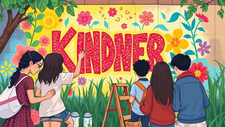 As autumn glowed in shades of amber and gold, Mia’s heart raced with excitement at what was to come. ‘You know what would be fun?’ she began, looking at her friends one crisp afternoon in the Kindness Garden. ‘A mural that tells the story of our garden!’ Leo’s eyes sparkled with enthusiasm, ‘That sounds amazing! We can all add something to it!’ Noah jumped in with glee, ‘And we could paint it together for the festival!’ Jamie, well integrated into the group now, chimed in, ‘I can bring paints and brushes! Galore for everyone!’ Determined, they collaborated on the mural design, each kid contributing snippets of ideas. Tara suggested, ‘Let’s have a huge butterfly in the center—symbolizing our friendship!’