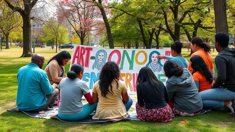 As dusk descended and the warmth lingered, the park transformed into a canvas of human experience. Looking back at their work, Mira felt a surge of ambition. ‘What if we make this a regular gathering? Art therapy for us all?’ ‘Absolutely,’ Kael replied with enthusiasm, ‘A space where every shard of pain can bloom into beauty.’ Their excitement was contagious, spreading through the gathered crowd. ‘We should post about it online!’ Jake suggested, pulling out his phone. ‘Let the world see what we’ve created together!’ This prompted Adira to say, ‘Social media can amplify our stories beyond our neighborhood.’ With a click and a flurry of hashtags, their community art initiative was born. The idea sparkled in their eyes, images of future events blossoming in their minds. ‘Imagine this canvas traveling to schools, inspiring others,’ Eleanor exclaimed, her wisdom drawing nods from the younger artists. Jonah chimed in, ‘And we could hold workshops for those who feel lost, giving them the tools to express themselves.’ Theo, still holding his brush, exclaimed, ‘Can I help make the next one? I want to paint even bigger rockets!’ The crowd laughed at his contagious enthusiasm, but the sentiment struck a chord. Each person present was ready to invest in future gatherings. Just then, Lila gathered the musical notes from earlier and declared, ‘Let’s write a song about this experience! Singing together will bond us even tighter!’ ‘A beautiful idea, Lila!’ Kael clapped, ‘What do you all think?’ The chorus of approval strengthened their collective bond, forming a vibrant tapestry of creativity. As night approached, Mira distributed paper to everyone: ‘Let’s write what this means to us—dreams, fears, longing.’ One by one, they penned their thoughts, sharing their secrets: ‘I’m scared of being forgotten,’ Marcus wrote hesitantly, ‘But this is where I remind myself I belong.’ Abiding by his words, Theo shouted, ‘You’re also super cool!’ The laughter that followed alleviated some of Marcus’s fears. Eleanor, now surrounded by young energetic artists, leaned on her cane. ‘We’re only as strong as the stories we dare to share,’ she said, wise eyes sparkling in the gathering glow. ‘Those unvoiced struggles about love, joy and loss—they are the thread that keeps us united.’ Kael nodded again, ‘And art is our loom, weaving us together.’ Just then, a firefly danced near them, its glow mesmerizing. ‘Let’s name her Hope,’ Mira announced, her expression brightening. As they continued building their canvases with dreams, a familial warmth blanketed the scene, banishing loneliness far into the distance. Hours vanished as they engaged, filling the air with music and warmth. Finally, just before the clock struck nine, Kael raised his hand, ‘Let’s raise our paintbrushes as a commitment to each other! To continue this connection and to paint our stories brightly.’ With all eyes brightened by the communal effort, an electrifying sound echoed through the park as they raised the brushes high in celebration. Lila began a sweet tune, drawing them closer. This marked more than just an art event—they were creating a profound movement. ‘Tomorrow, we meet again!’ Jake announced with renewed vigor. ‘Let’s become a home of creative exploration, a sanctuary for truths unfolding!’ Blooms of inspiration ignited within them all, a mixture of joy and purpose blossoming as bright as their already vibrant artwork. Standing united, they breathed in the night air, filled with excitement for the artistic journey yet to come.