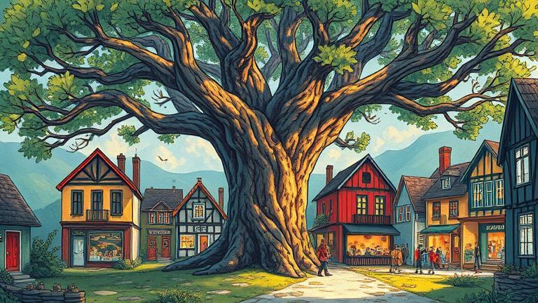As the sun dipped below the horizon, casting a golden hue over Finnebrock, Lila, Mira, and Garrick sat beneath the great tree, their hearts still humming with excitement from the day’s joyous celebrations. Lila looked up at the brilliantly decorated branches, colorful threads blowing softly in the evening breeze, and couldn’t help but grin. ‘I can’t believe how much we accomplished today,’ she exclaimed, her eyes sparkling with joy.