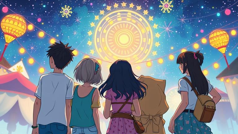Under the dazzling tapestry of the starlit sky, the festival buzzed with anticipation. Young artists and villagers filled the hillside, their laughter mingling with whispers of enchantment. Leo, brimming with enthusiasm, looked at his friends gathered nearby. ‘Tonight, we create magic beyond imagination,’ he declared, standing tall amid the gathered crowd.