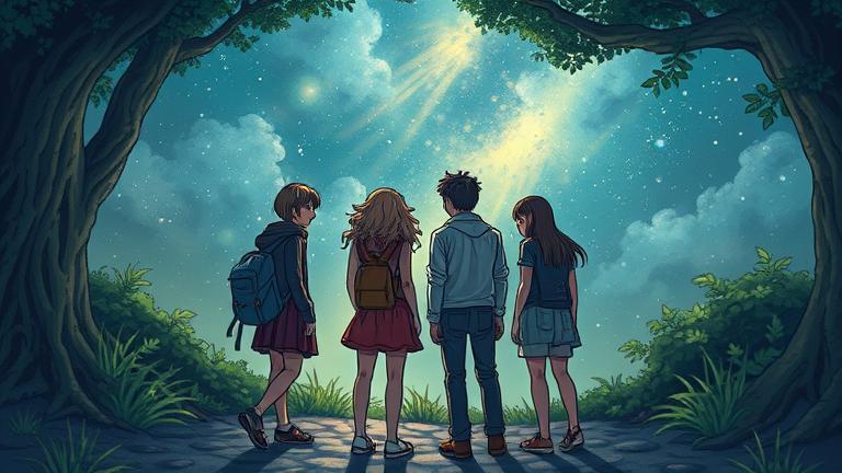 As Mira, Tariq, Elara, and Lorian sat beneath the ancient trees, the night deepened, the air now thick with anticipation and a hint of magic. Lorian, sensing a shift, encouraged deeper conversation. ‘Do any of you have fears that linger like shadows, even as you plan for tomorrow?’ His voice was both soft and commanding, urging them to explore further.