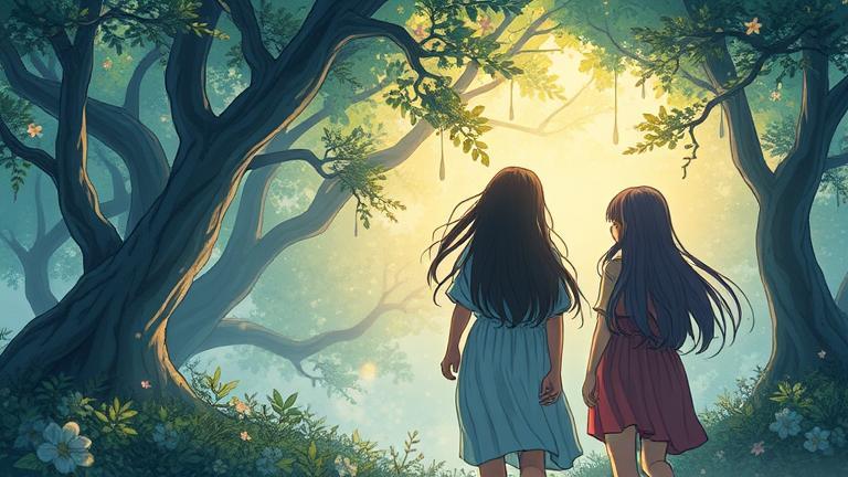 Under a canopy of glowing leaves, the trio sat on roots as thick as their bonds. Soft moonlight filtered through, illuminating their faces.